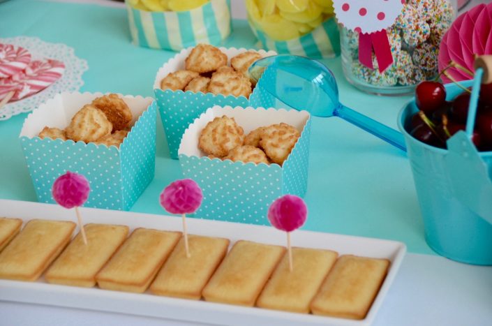 LES PATISSERIES – Des cupcakes dans les tons pastels, de petits financiers aux amandes et des rochers Rafaello hummmmm….. Sans oublier des fraises tagada et des petits bonbons citrons.
