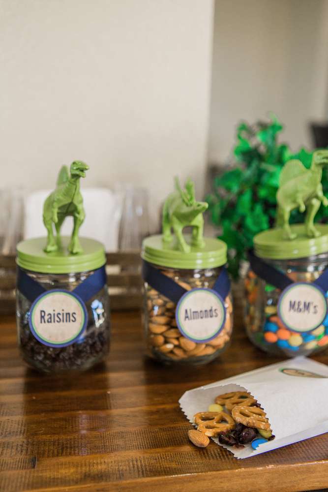 LES PATISSERIES – Les macarons praline et vanille sont couleur « sable ». On retrouve des chocolats individuels personnalisés, des mini verrines au chocolat et des cheesecakes citron vert, sans oublier la pièce maîtresse : un layer cake blanc qui trône au milieu. Les bonbonnières sont toutes ornées d’un dinosaure différent.