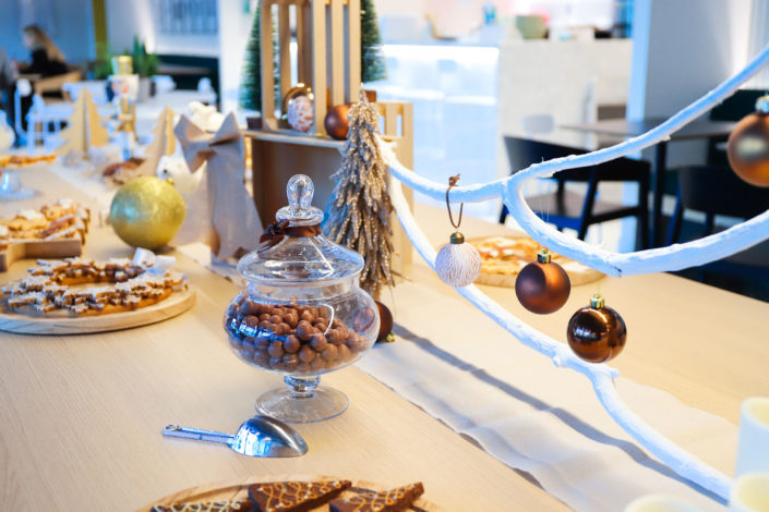 Et côté pâtisseries, de petits sablés décorés renne, bonhomme de pain d’épices, traîneau, ainsi que des sablés fourrés au Nutella, des chamallows bonhommes de neige, des oreo enrobés décorés, des sapins meringue… et bien sur beaucoup de chocolats pour les petits gourmands !