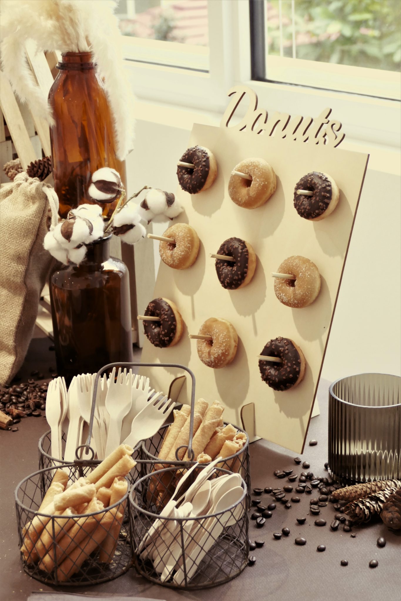 Je vous montre aujourd’hui le goûter thème café que j’ai réalisé pour L’Agence Nationale de la Cohésion des territoires, située dans les locaux du Premier Ministre (wahou) à l’occasion de la Journée Mondiale du Café. Une table dans les tons chocolat et beige, avec une décoration faite d’anciens moulins à café en bois, de sacs de toiles de jute, de vases couleur ambrée, de présentoirs à donuts en bois, de la cannelle et badiane… Est-ce que vous avez vu ces jolis petits sablés décorés en forme de mug de café ?
