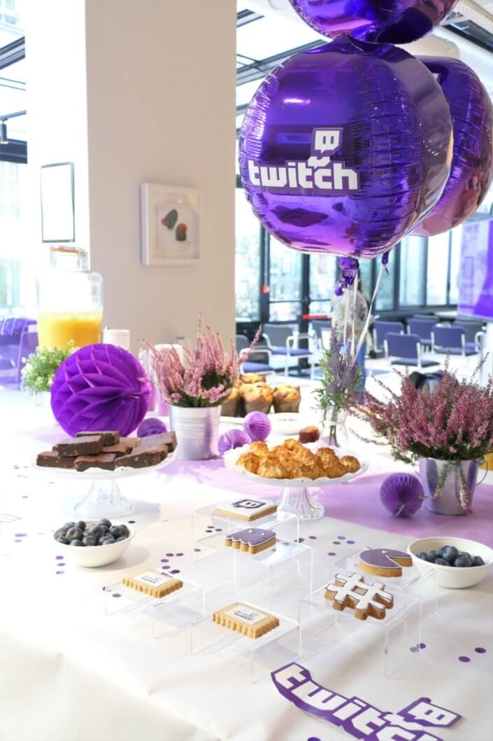 Hier j’ai eu l’honneur d’installer une pause gourmande pour Twitch, en effet, l’équipe est venue chez Dentsu faire une intervention auprès des collaborateurs. L’occasion pour moi de proposer de l’ultra-personnalisation : table aux couleurs du logo, ballons personnalisés, sablés décorés forme manette de jeux vidéos, pacman et space invaders 🙂 et jusqu’au gobelets violets avec le logo !
