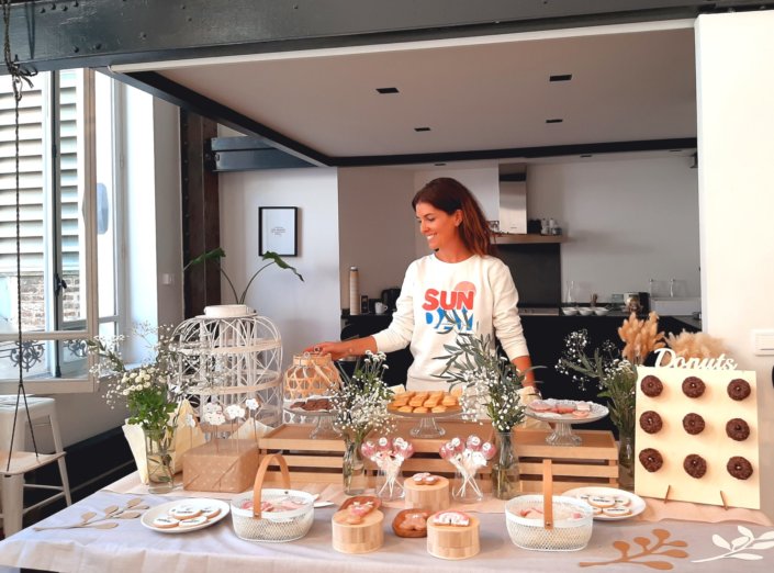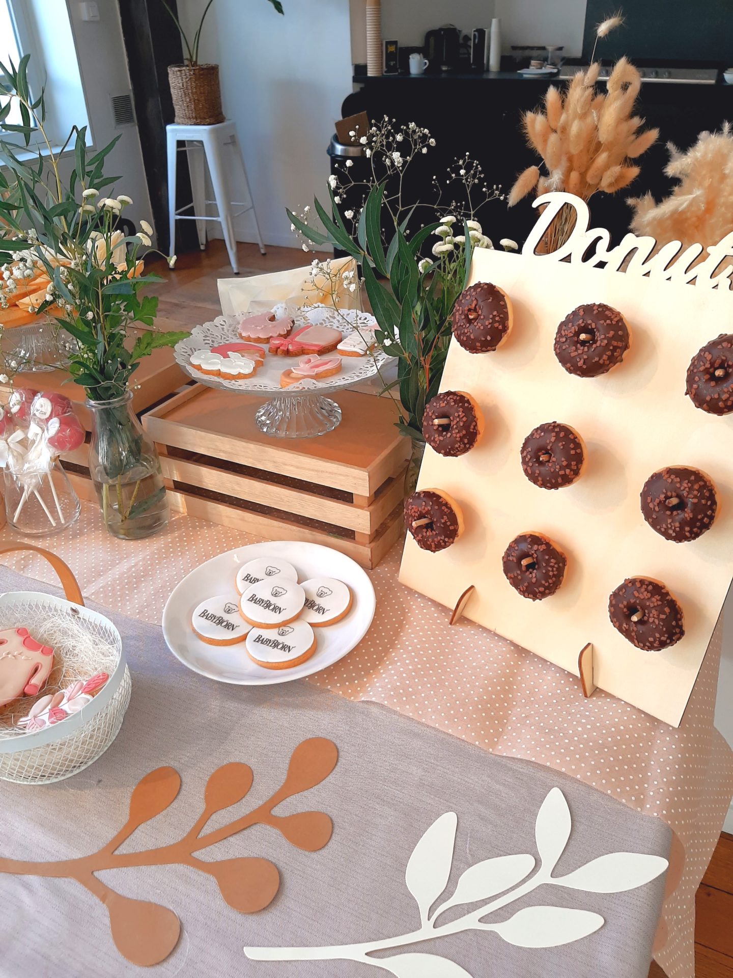 Des tons doux de beige, rose poudré, des fleurs fraîches avec du gypsophile et de l’eucalyptus, de mignons petits sablés décorés en forme de body, hochet, poussette, … sans oublier des cakepops, des financiers, des donuts chocolat.