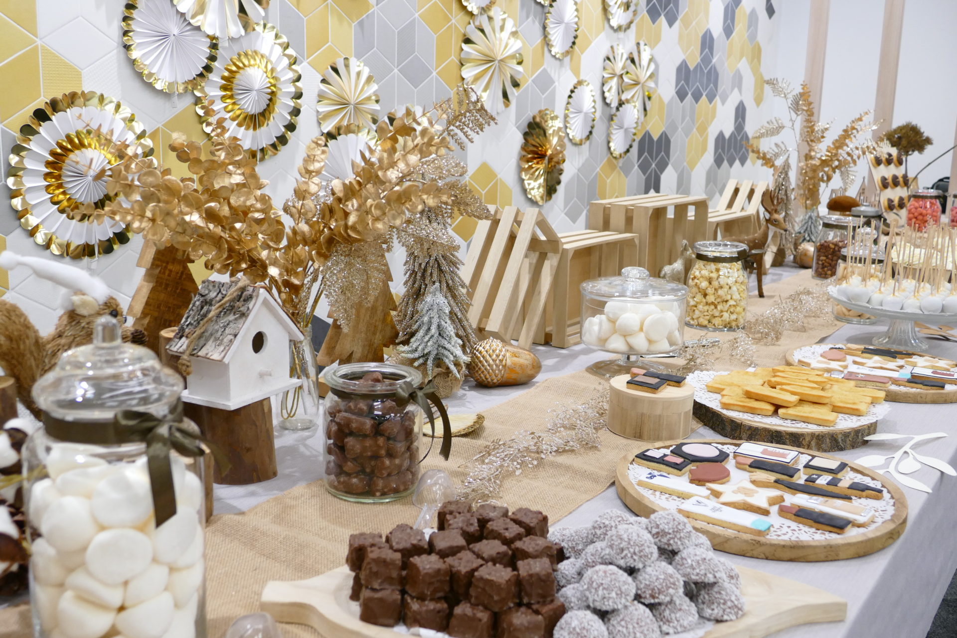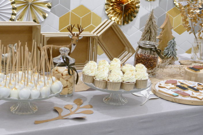 La semaine dernière, j’étais dans l’un des grands buildings L’Oréal à Clichy, pour la remise des médailles des “anciens” collaborateurs, ceux qui fêtent leurs 10,20, 30 et 40 dans la société. Pour l’occasion, car 300 invités étaient présents, j’ai dressé un grand goûter d’entreprise aux couleurs des médailles, une table sur mesure en doré, blanc, beige et bois. Une table festive, où se mêlaient sablés décorés sur mesure (avez-vous vu les biscuits en forme de shampoing Kerastase, crème CeraVe, crème Vichy ou encore les vernis Essie ? ) Oui, du 100% sur mesure pour cet événement. Côté décoration, des cagettes en bois, des sapins dorés, et de jolies rosaces que nous avons placés au mur. Les invités ont été sensibles à la décoration et aux gâteaux, cela a été un bel événement ! 🙂
