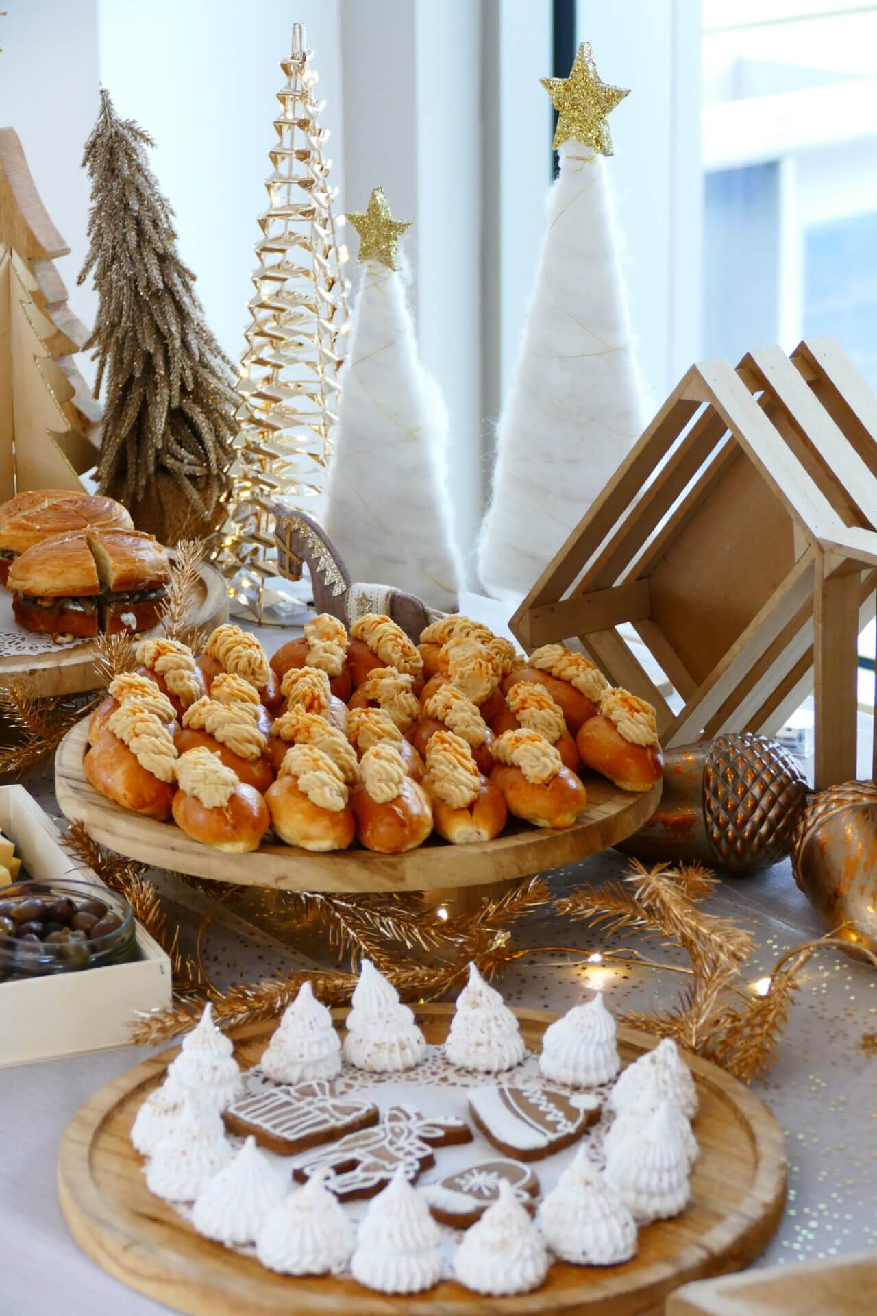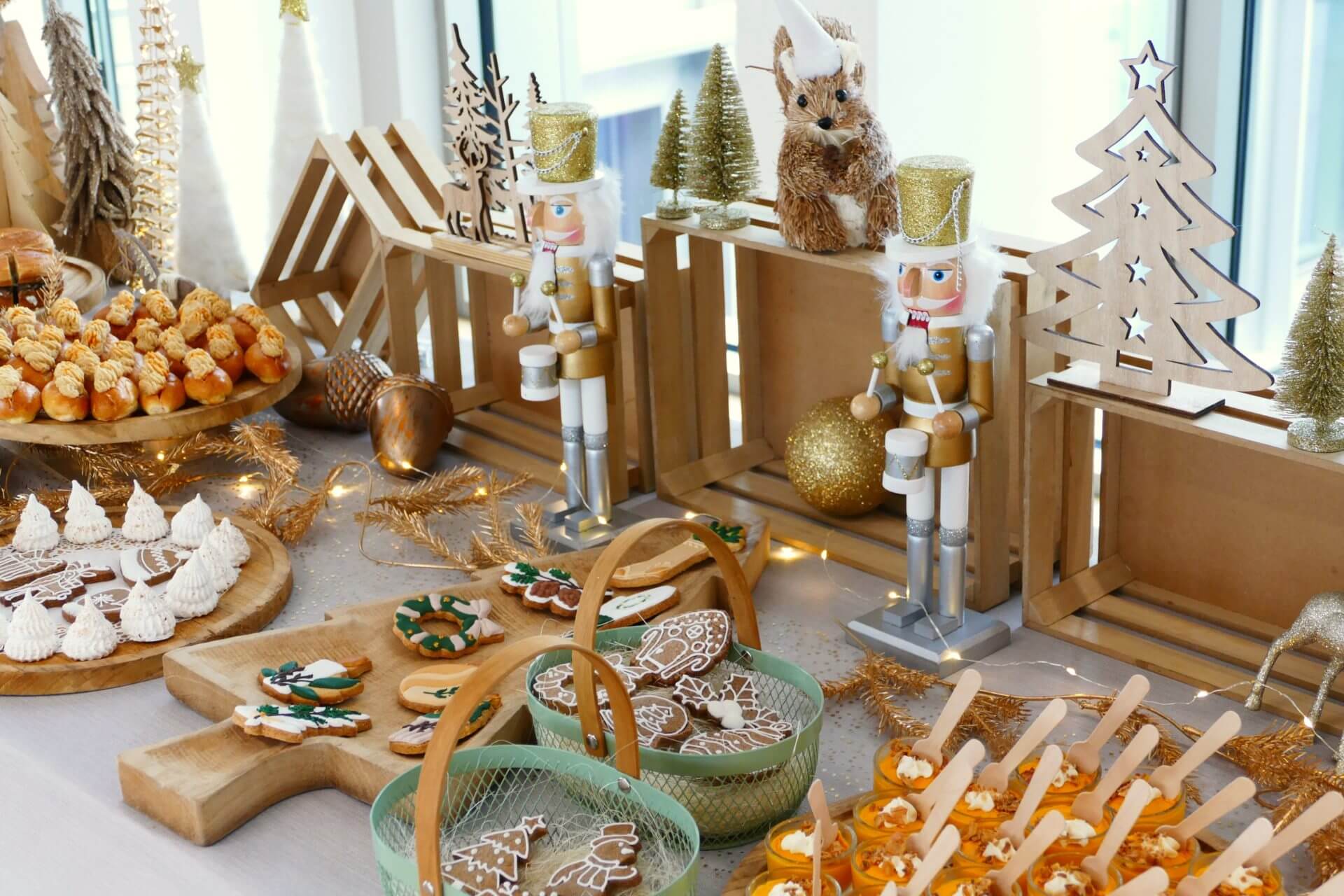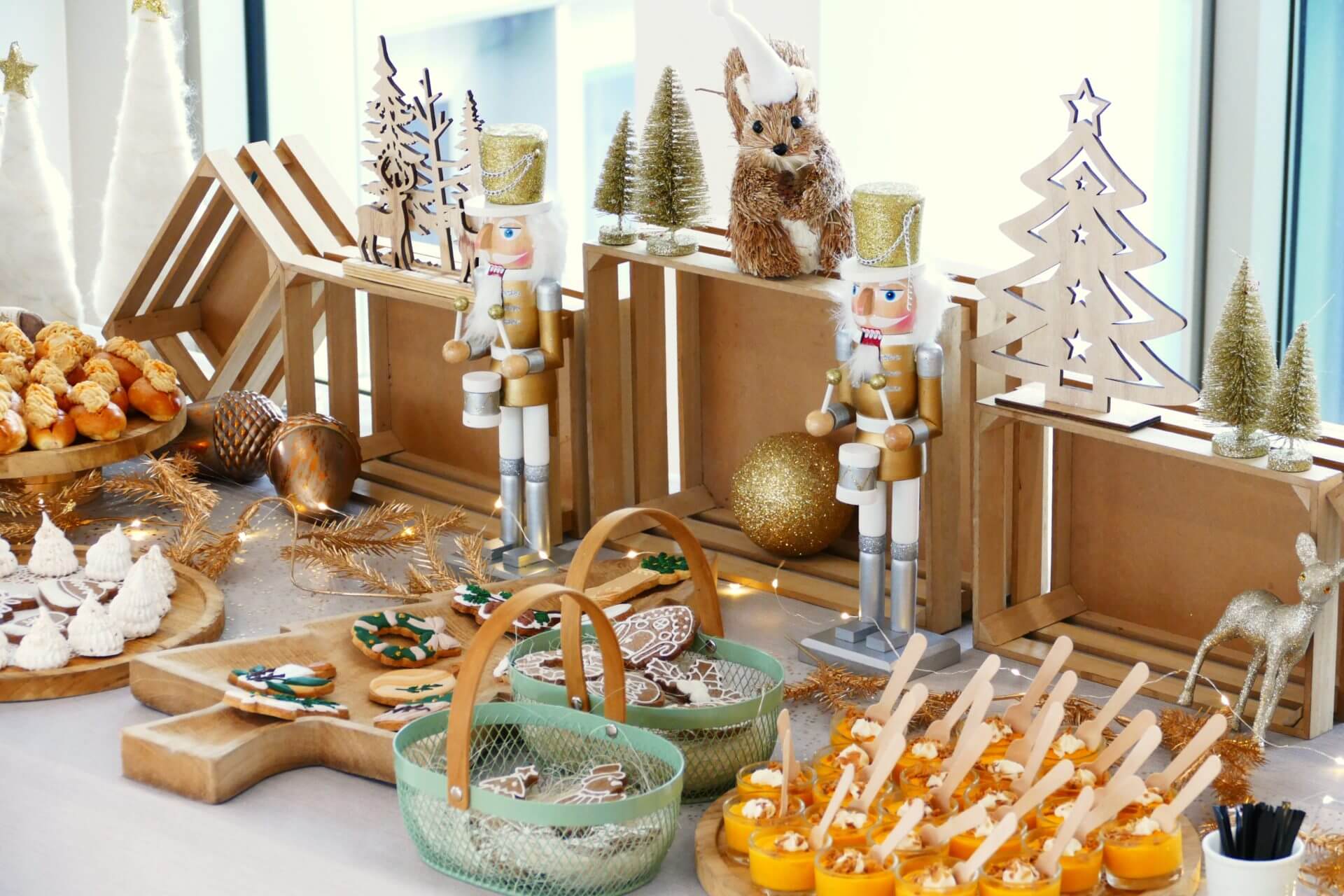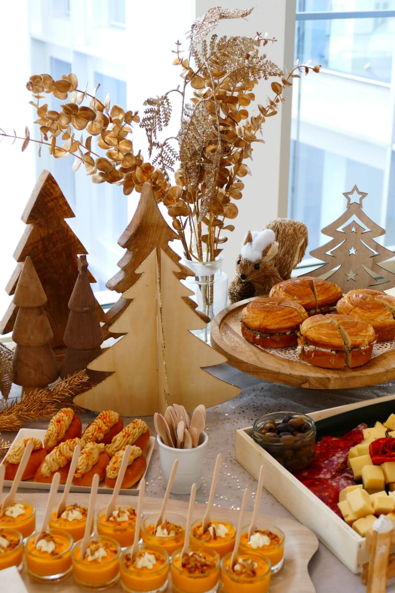 Cocktail de Noël pour Hermès par Studio Candy avec planches de charcuteries, fromages, verrines de potimarron, sablés décorés de Noël, meringues sapin et décoration tout en or et bois